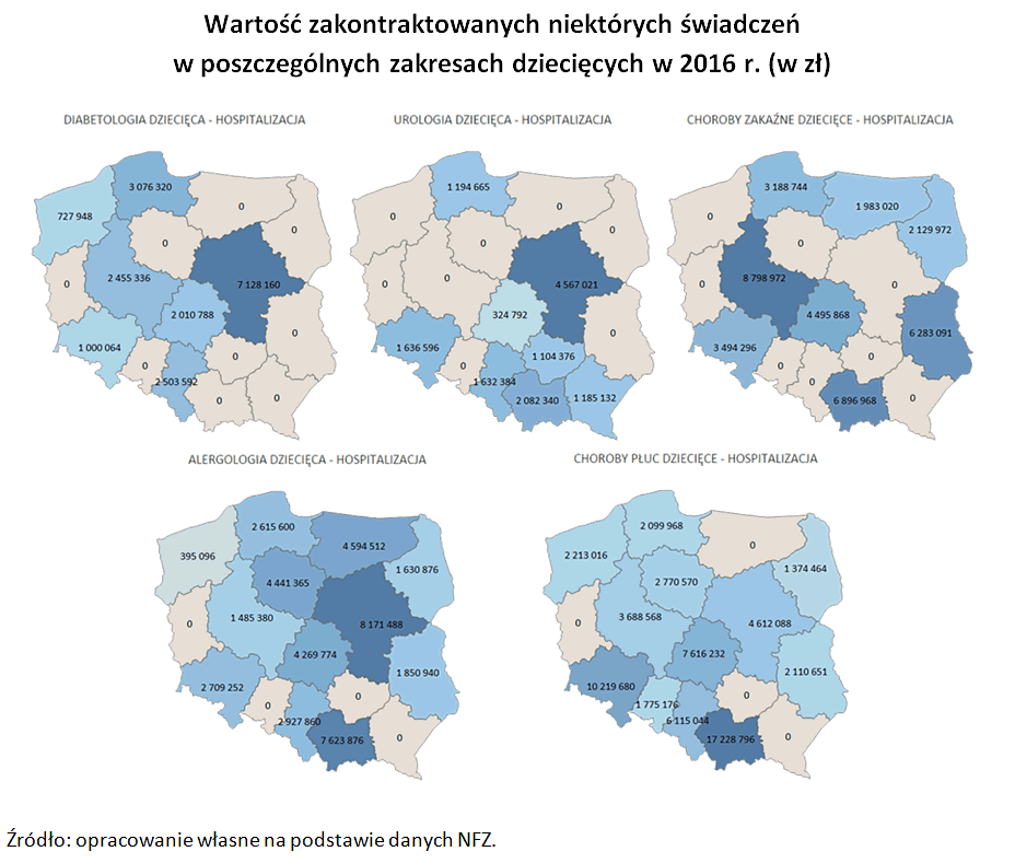 Na terenie działania części oddziałów wojewódzkich Funduszu w ogóle nie było lekarzy określonych specjalności, jak np.: lekarza specjalisty chorób płuc dzieci w Dolnośląskim, Lubuskim, Łódzkim, Opolskim, Podkarpackim, Pomorskim, Świętokrzyskim, Warmińsko-Mazurskim, Wielkopolskim, Zachodniopomorskim, w zakresie immunologii klinicznej w Lubuskim, Opolskim, Podkarpackim, Zachodniopomorskim OW, endokrynologii i diabetologii dziecięcej w Kujawsko-Pomorskim, Lubuskim, Łódzkim i Warmińsko-Mazurskim OW, otorynolaryngologii dziecięcej w Opolskim, Świętokrzyskim, Zachodniopomorskim OW, chirurgii plastycznej w Opolskim OW.