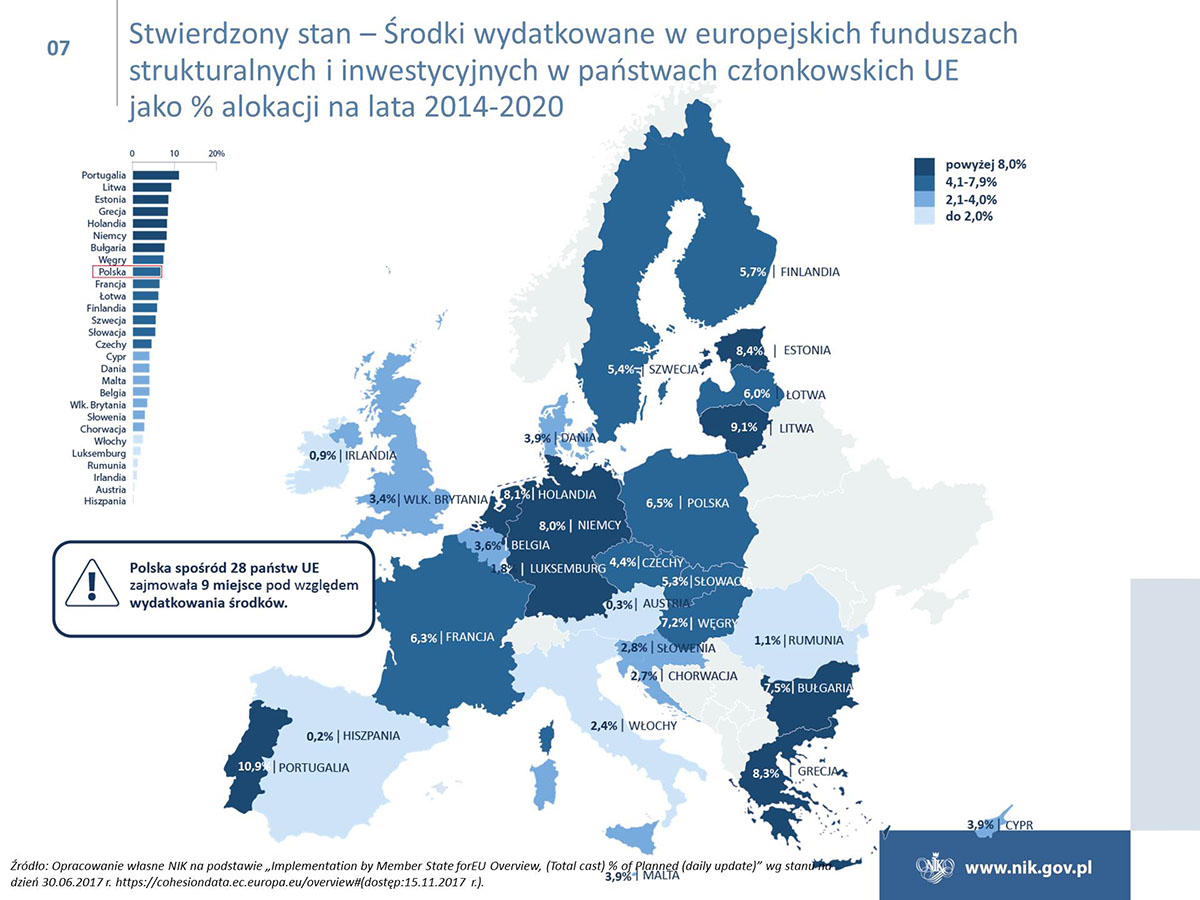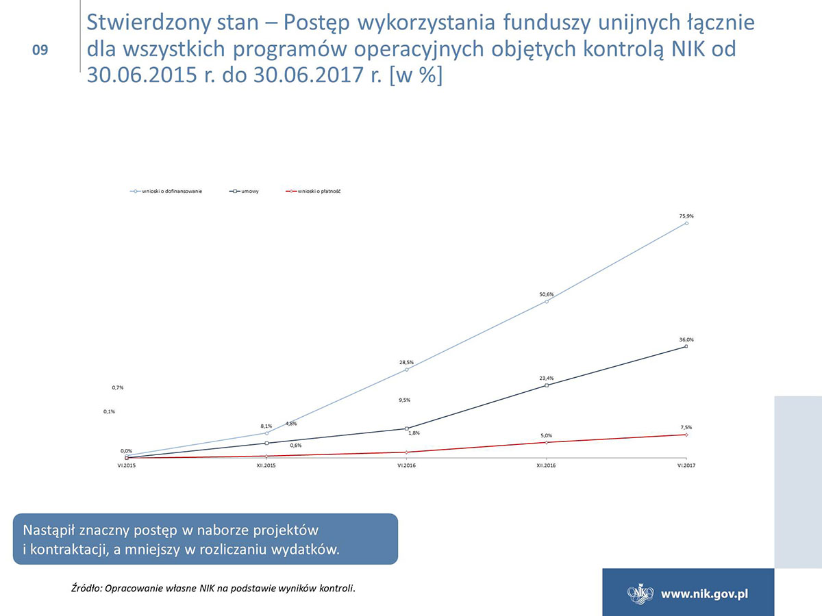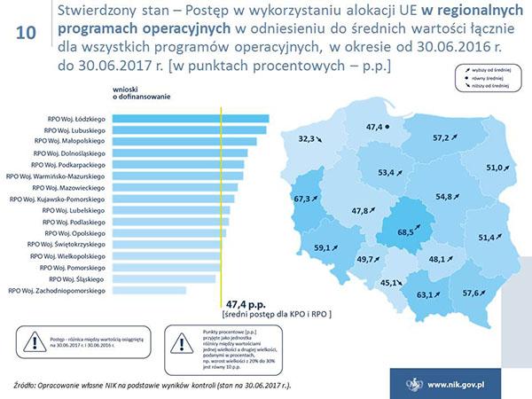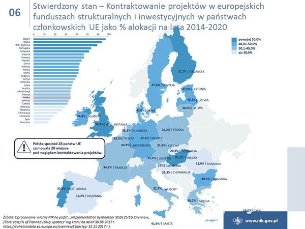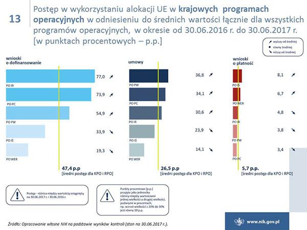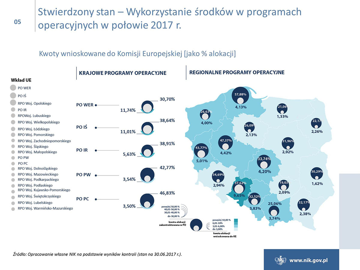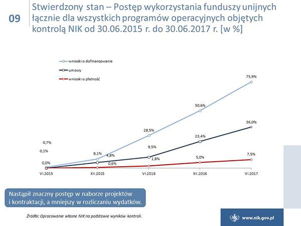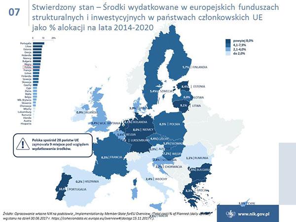 Polska w ramach polityki spójności ma do wydania ok. 80 mld euro i jest największym beneficjentem unijnych funduszy. Niestety poziom wydatkowania funduszy jest ciągle niezadowalający, i to pomimo znacznej poprawy w naborach wniosków o dofinansowanie i w zawieraniu umów z beneficjentami. Tylko w przypadku Programu Operacyjnego Infrastruktura i Środowisko osiągnięto poziom certyfikacji wydatków, który był określony w Planie działań Rady Ministrów na koniec 2016 r. Ponadto NIK wskazuje na duże zróżnicowanie w realizacji osi priorytetowych, a stan realizacji niektórych z nich jest na bardzo niskim poziomie. W przypadku poważnego niepowodzenia w realizacji celów, Komisja Europejska może zastosować sankcje finansowe.