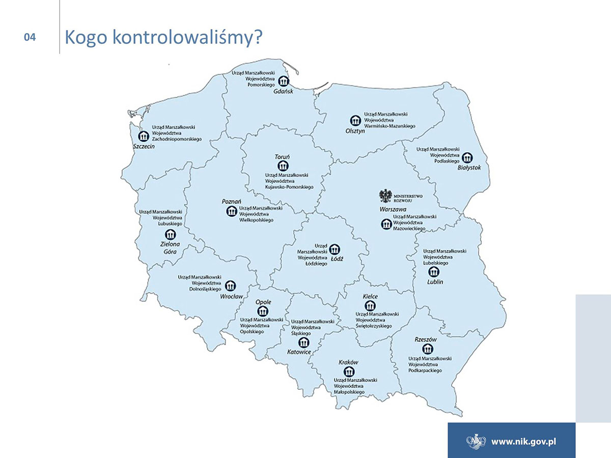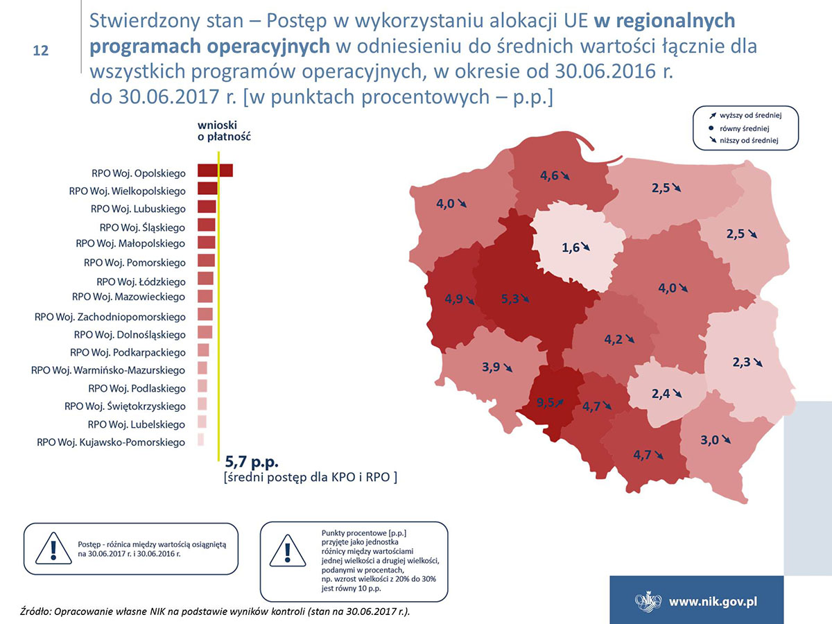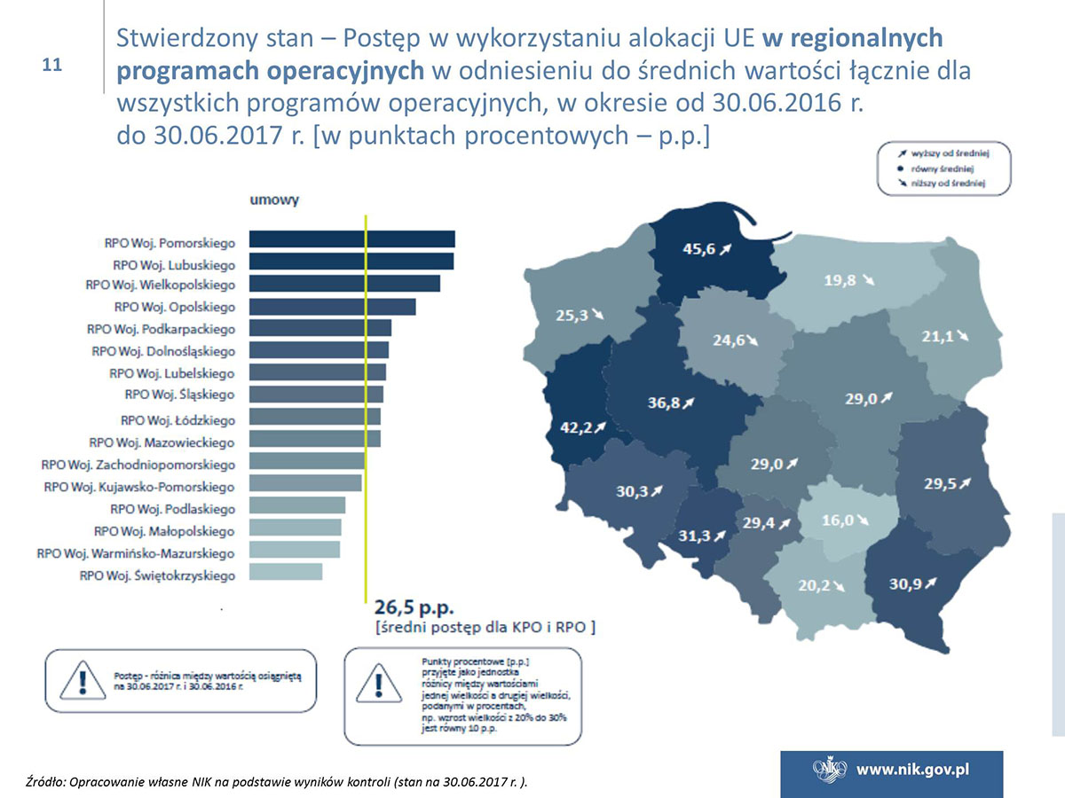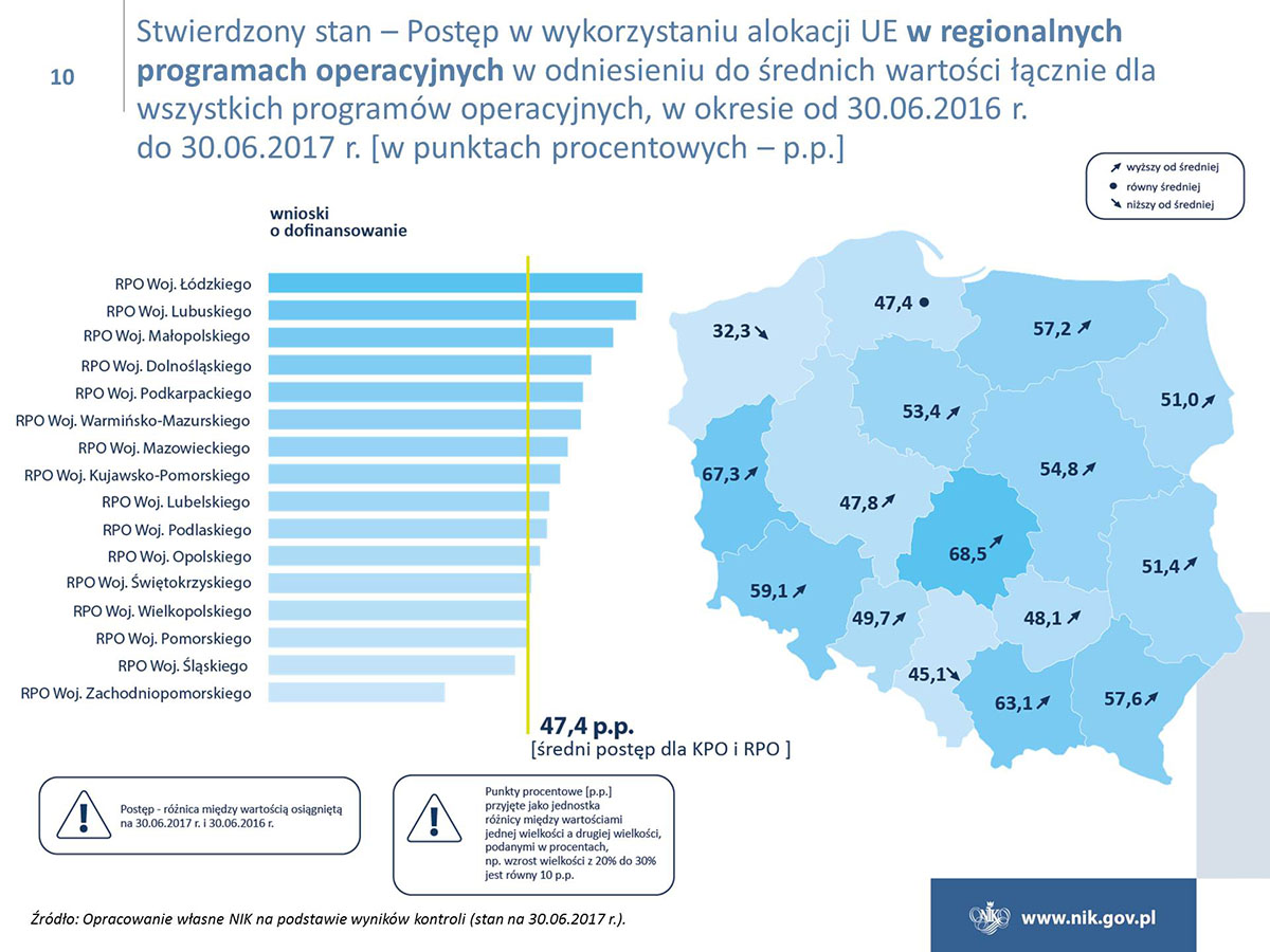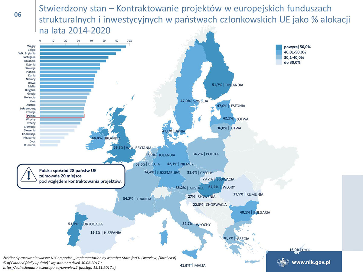 Polska w ramach polityki spójności ma do wydania ok. 80 mld euro i jest największym beneficjentem unijnych funduszy. Niestety poziom wydatkowania funduszy jest ciągle niezadowalający, i to pomimo znacznej poprawy w naborach wniosków o dofinansowanie i w zawieraniu umów z beneficjentami. Tylko w przypadku Programu Operacyjnego Infrastruktura i Środowisko osiągnięto poziom certyfikacji wydatków, który był określony w Planie działań Rady Ministrów na koniec 2016 r. Ponadto NIK wskazuje na duże zróżnicowanie w realizacji osi priorytetowych, a stan realizacji niektórych z nich jest na bardzo niskim poziomie. W przypadku poważnego niepowodzenia w realizacji celów, Komisja Europejska może zastosować sankcje finansowe.