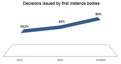 - high percentage of annulled decisions taken by the first instance bodies. Although this number has fallen slightly since 2011, it is still significant. The percentage of annulled decisions taken by tax offices was 34.4 percent (in 2012 it was 35.5 percent). The percentage of decisions taken by tax chamber directors and annulled by provincial administrative courts was 17.9 percent in 2011, in 2012 it went down to 14.7 percent but in the first half of 2013 it spiked to 19.7 percent;
